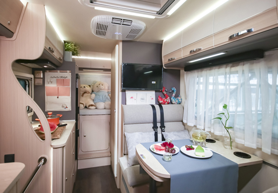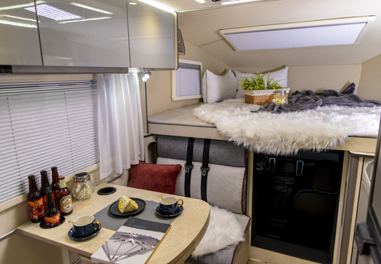 與自行式A型房車相比,自行式C型房車空間稍顯不足,但又比自行式B型房車空間寬敞、設備齊全--起居室、廚房、盥洗室、臥室具有大量櫥柜,攜帶大量行李絲毫不成問題。同時車內具有影音娛樂系統(tǒng)、空調、可轉化桌沙發(fā)椅等,總而言之,自行式C型房車是安裝在車輪上的空間緊湊、設備齊全的房車類型。